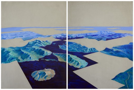 Of his work, Greville commented; “Canoeing on Lake Pedder in 2017 in the expanse of dark water, the almost black glassy depths and mountains held me in their beauty. A feeling of being absent from human clutter and noise settled on me, but the sudden recollection that this lake is a dam, tipped everything I was thinking on its side.”