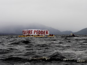 Paddling for the Restoration of Lake Pedder; eleven kayakers embarked on a 25km return trip to the site of the original lake, where they raisied a banner over the submerged beach, calling for restoration of Lake Pedder and the surrounding environs. A slightly larger group of Paddlers undertook a shorter 8km trip around Scotts Peak.