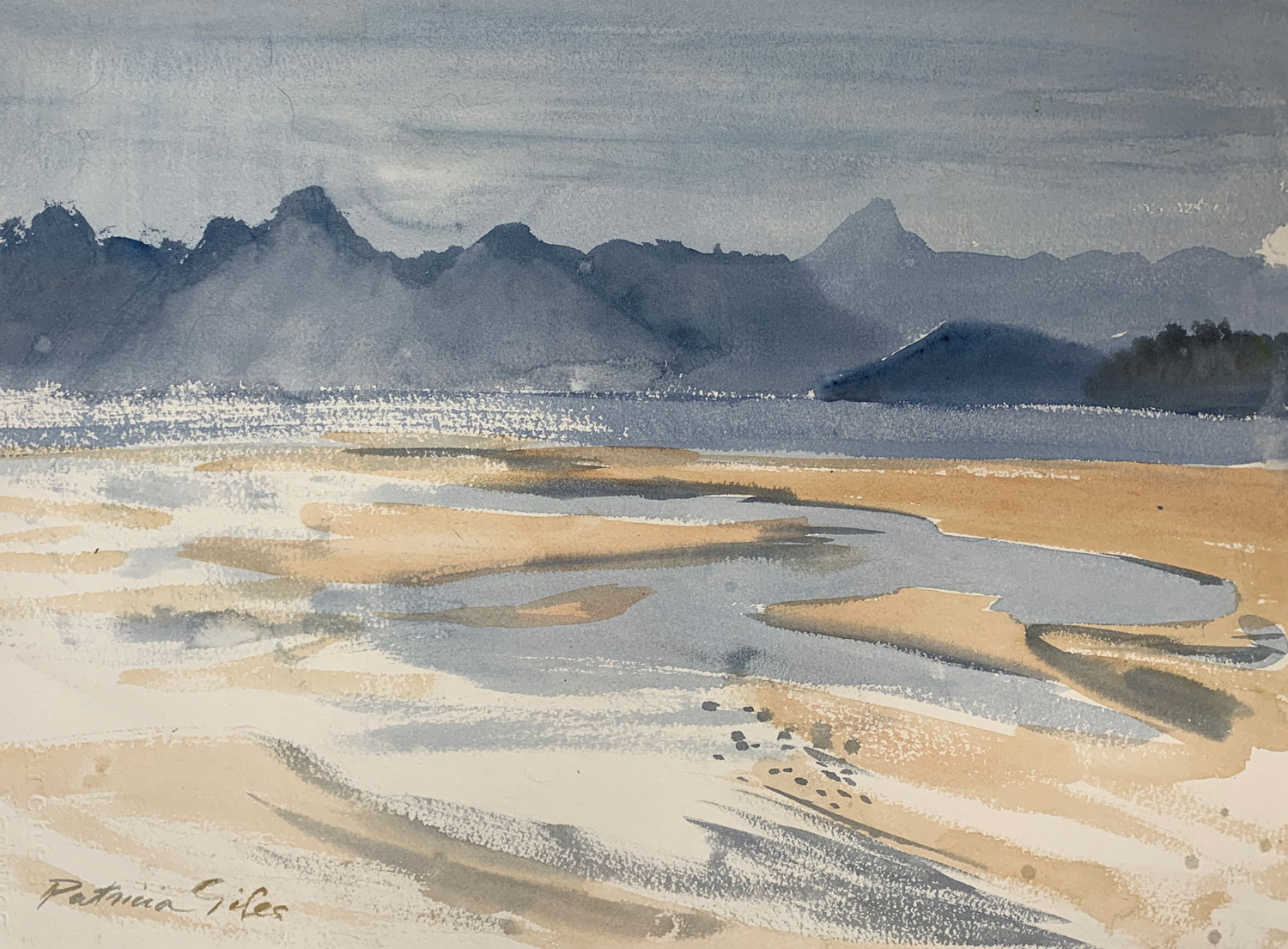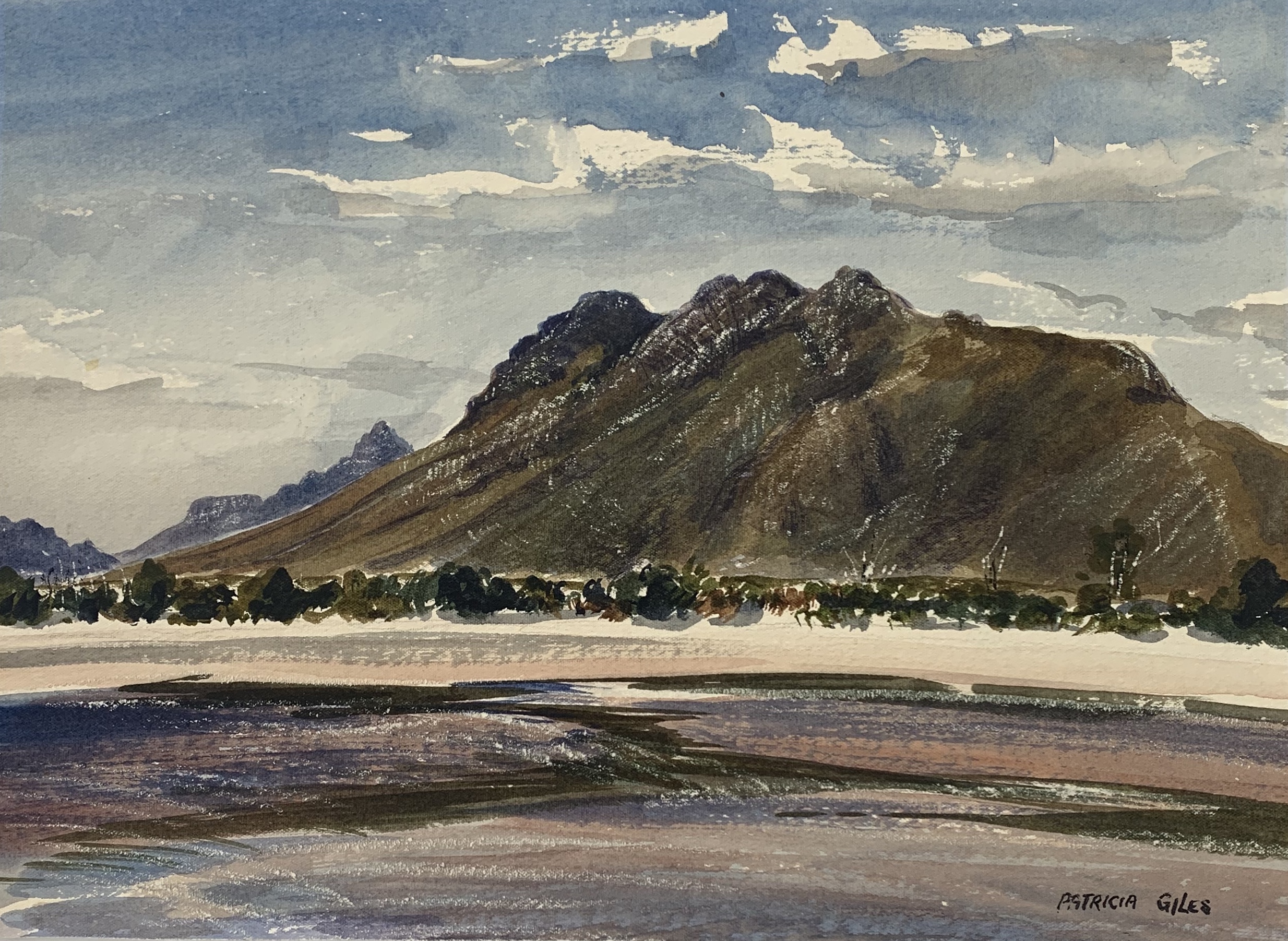 PATRICIA GILES was an artist with particular interest in the wild highlands of Tasmania. Since her youth she had been painting from her family’s weekend shack near Tasmania’s Great Lake where her father was a devoted angler. Her subjects were of the rugged mountains, rushing rivers and the small creatures which lived there. Later, many other places in Tasmania caught her attention as she travelled and painted alone, and with other Hobart artists gathering on Sundays to paint these mostly wild areas. They became known as The Sunday Painters, gathering about the well established painter Max Angus. Increasingly, over many years, their works were sought for the walls of distinguished homes in Tasmania and interstate. Patricia (Trish) painted in water colour, pastels, oil, charcoal and pen.Her friendship with Joan Brand, owner of The Chalet at Coles Bay enabled her to paint at many of the beautiful places on Tasmania’s East Coast and on the Freycinet Peninsular.